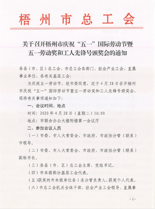 關(guān)于召開梧州市慶?!拔逡弧眹H勞動節(jié)暨五一勞動獎(jiǎng)和工人先鋒號頒獎(jiǎng)大會的通知