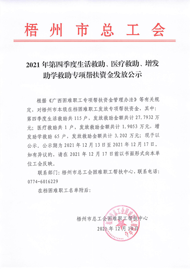 2021年第四季度生活救助、醫(yī)療救助、增發(fā)助學救助專項幫扶資金發(fā)放公示
