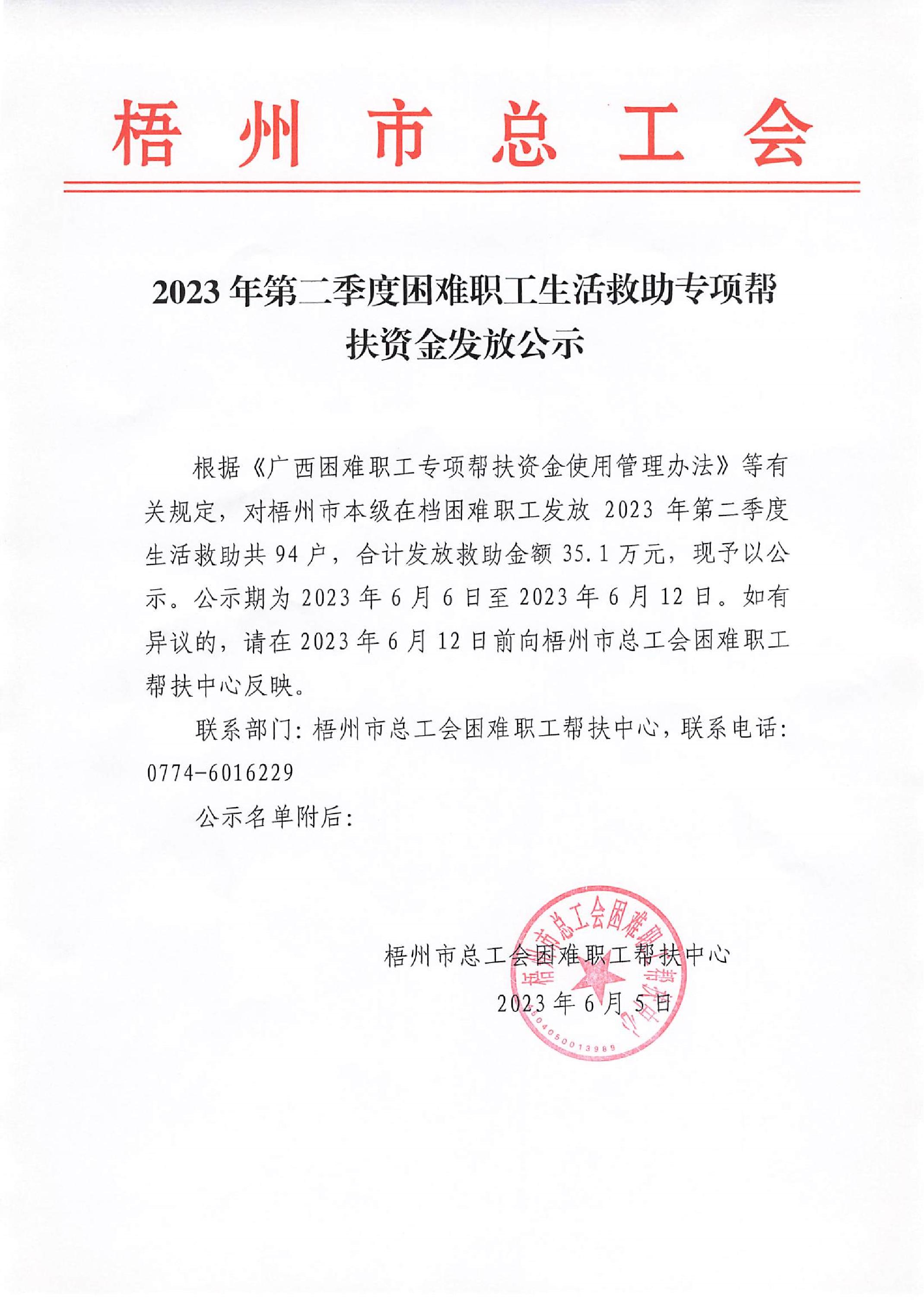 2023年第二季度困難職工生活救助專項(xiàng)幫扶資金發(fā)放公示