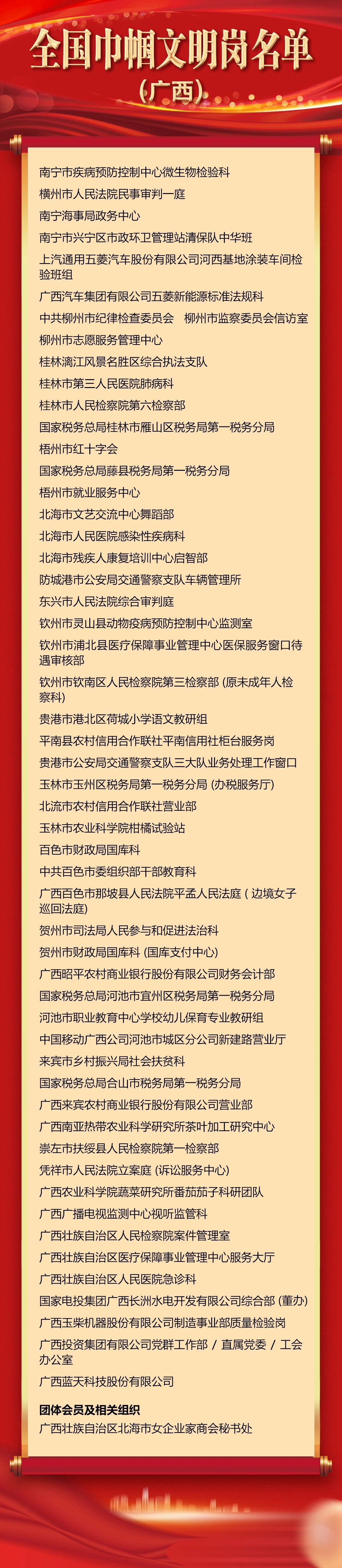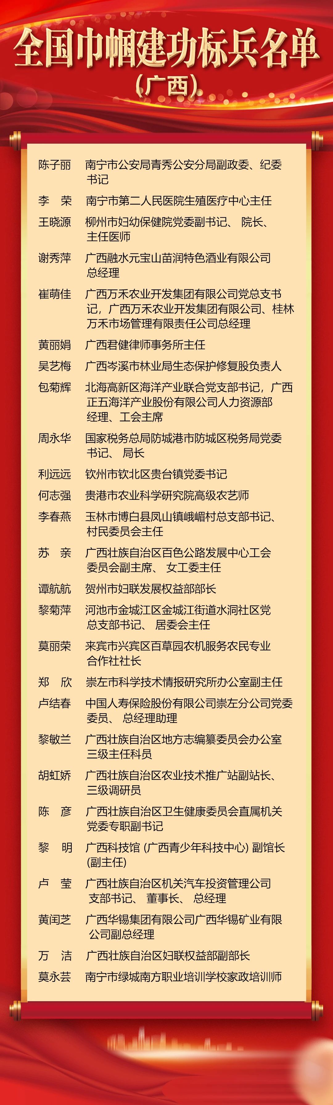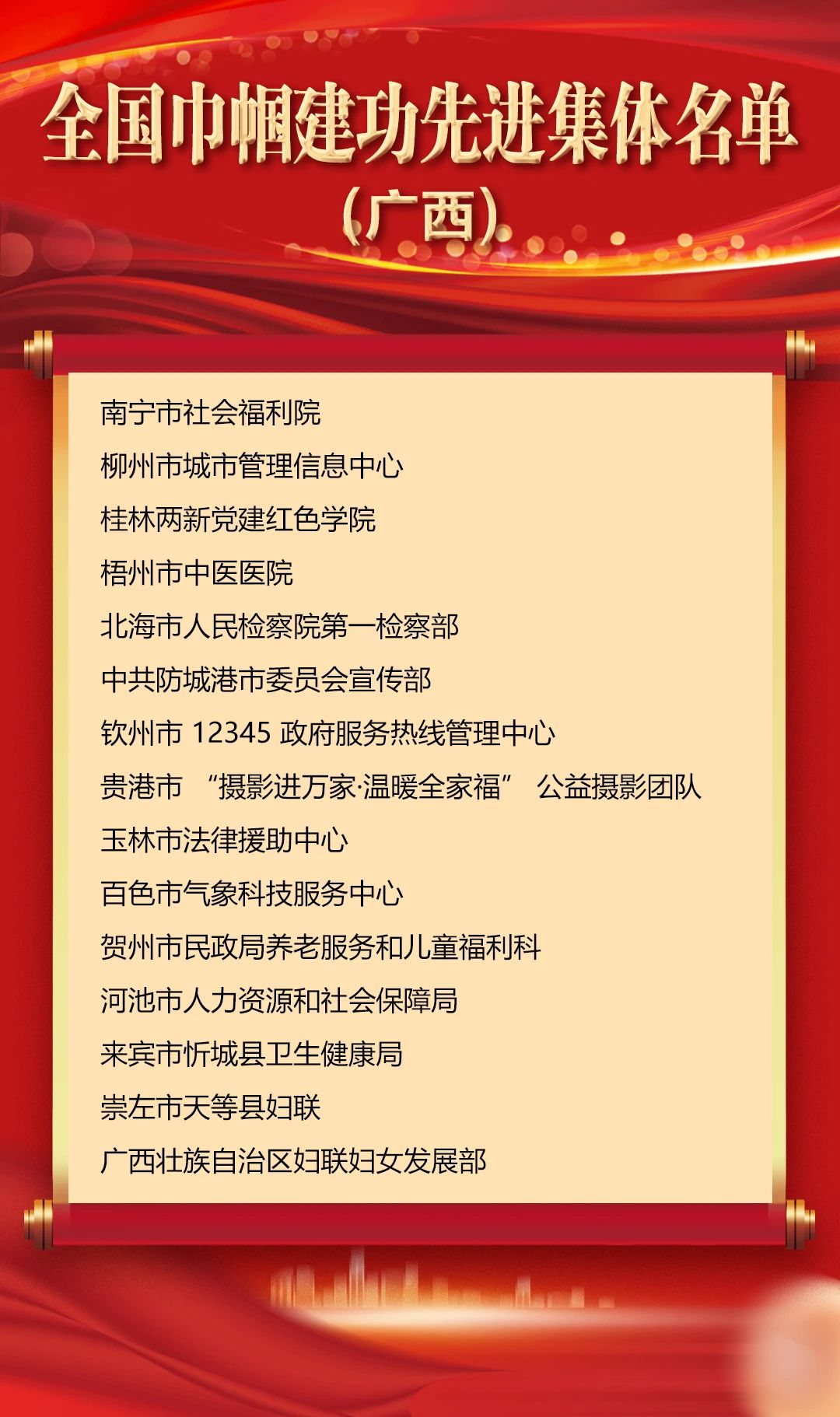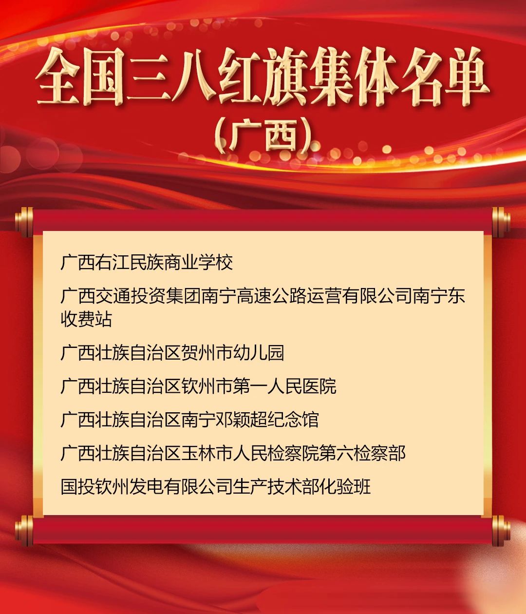 廣西獲獎(jiǎng)的個(gè)人和集體當(dāng)中,陳曉軍等9人被授予全國(guó)三八紅旗手稱號(hào);廣西右江民族商業(yè)學(xué)校等7個(gè)集體被授予全國(guó)三八紅旗集體稱號(hào);南寧市疾病預(yù)防控制中心微生物檢驗(yàn)科等54個(gè)集體被授予全國(guó)巾幗文明崗稱號(hào);陳子麗等26人被授予全國(guó)巾幗建功標(biāo)兵稱號(hào);南寧市社會(huì)福利院等15個(gè)集體被授予全國(guó)巾幗建功先進(jìn)集體稱號(hào)。